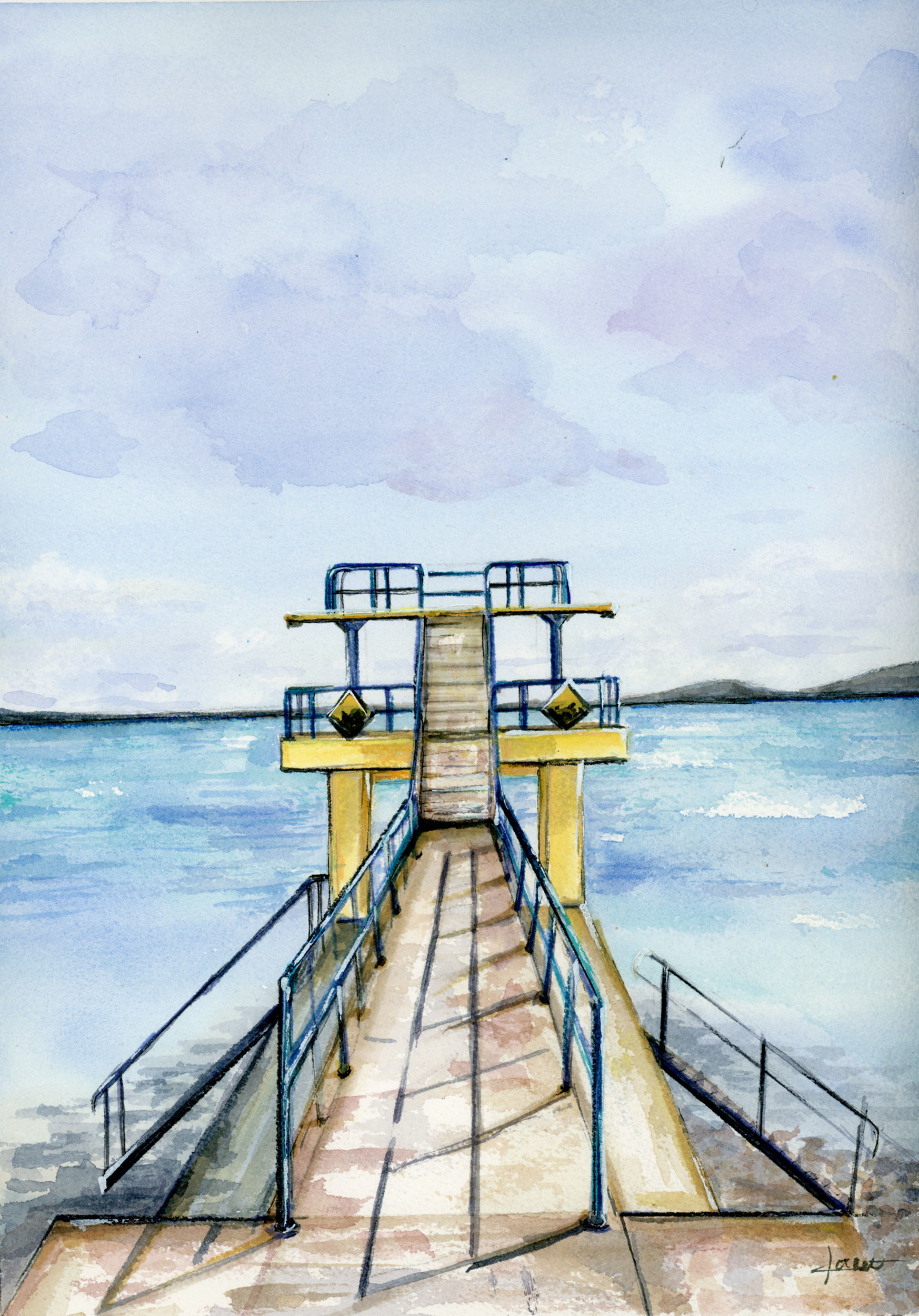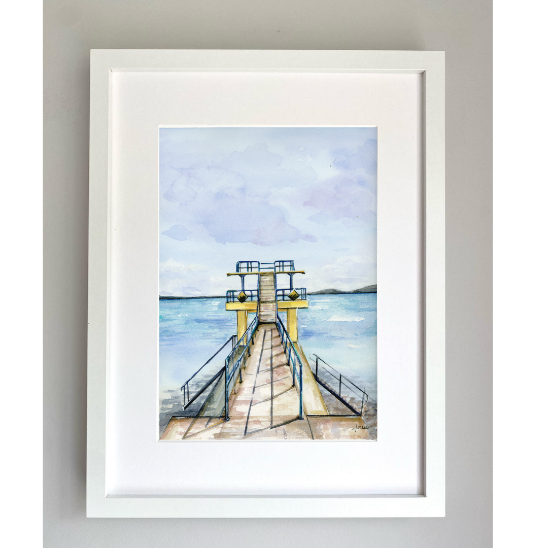 Print of original watercolour painting of Blackrock Diving Tower Galway, Ireland. Painted by Claire McConville.