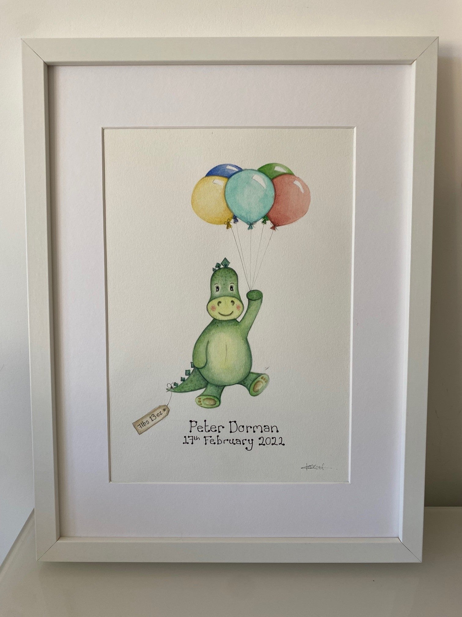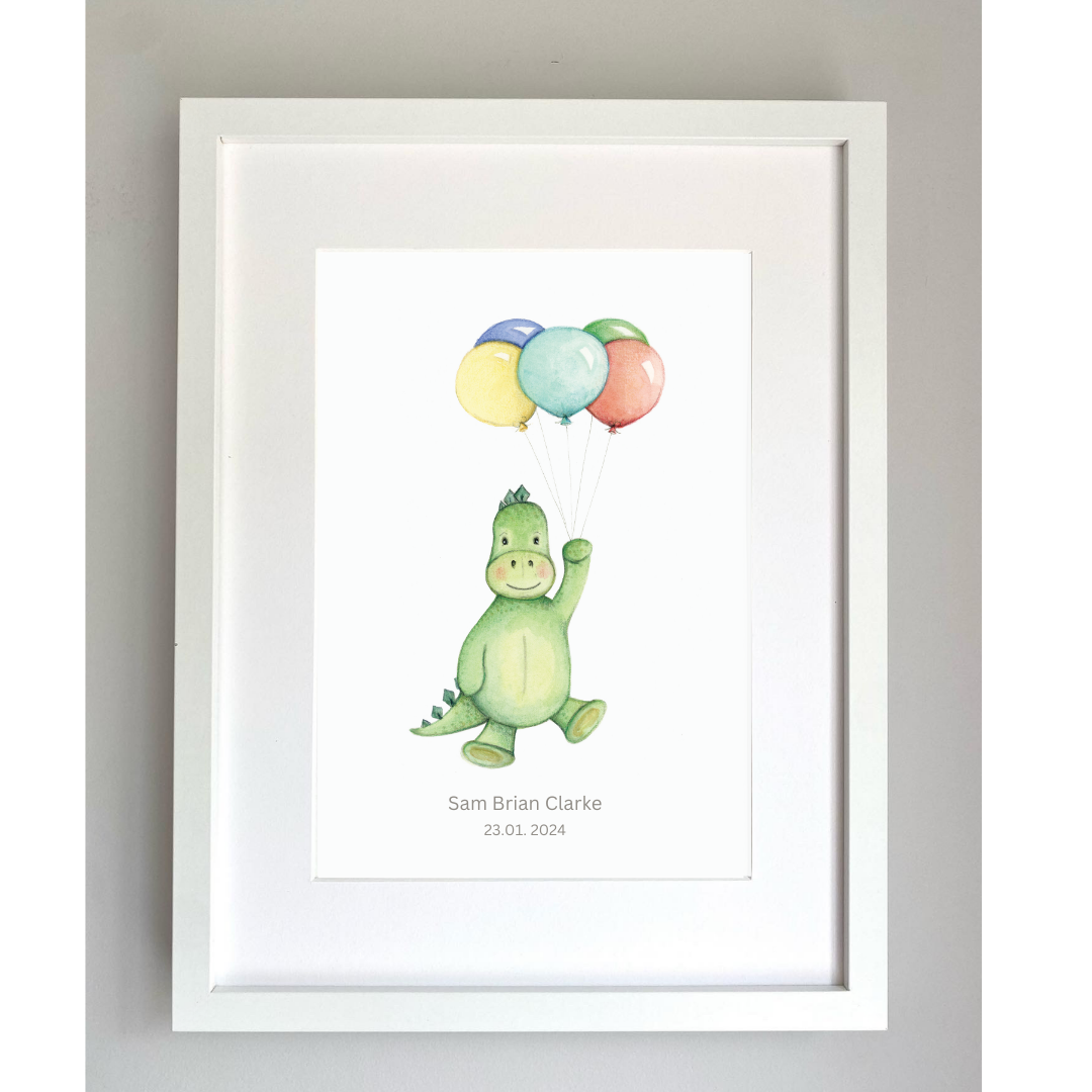 Fine Art Dino print. It will brighten up any room. Whether you want to decorate your nursery or surprise someone with a thoughtful gift for their new baby, this print is perfect for you. You can also customize it with the name and birth date of the baby or child you want to celebrate.