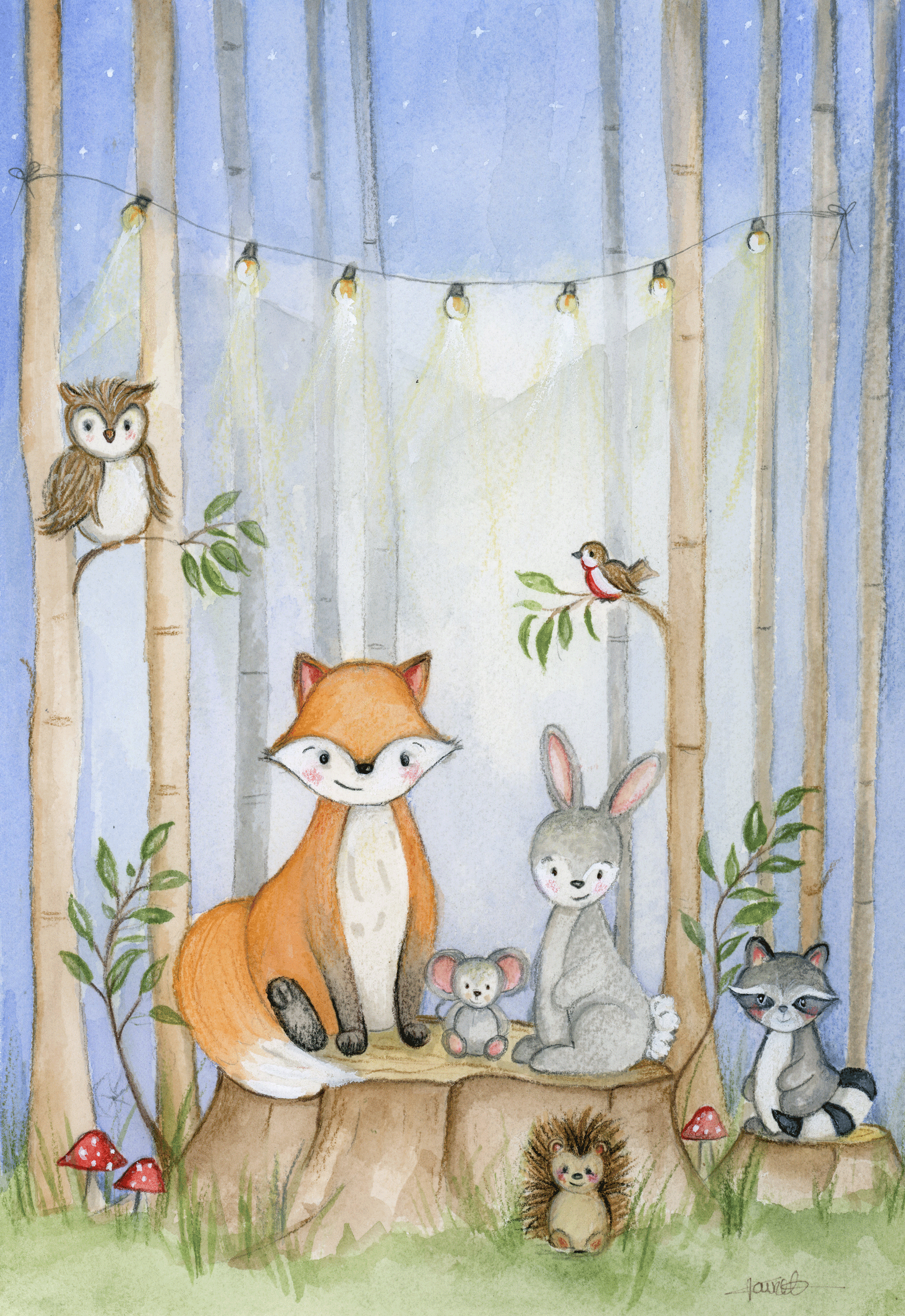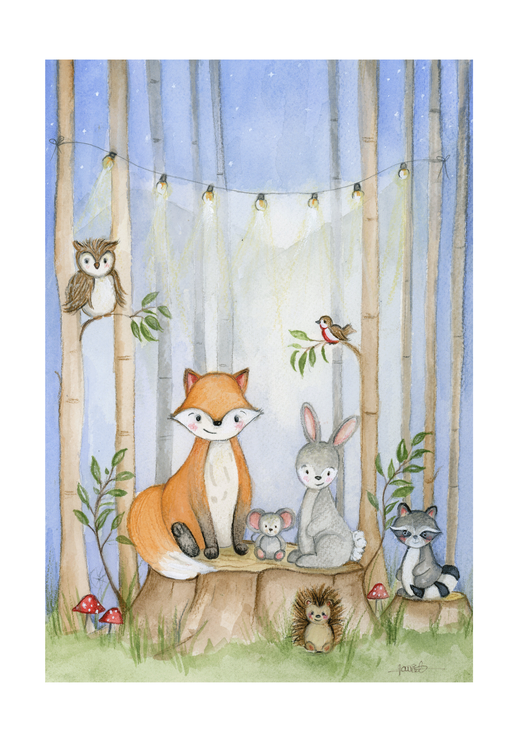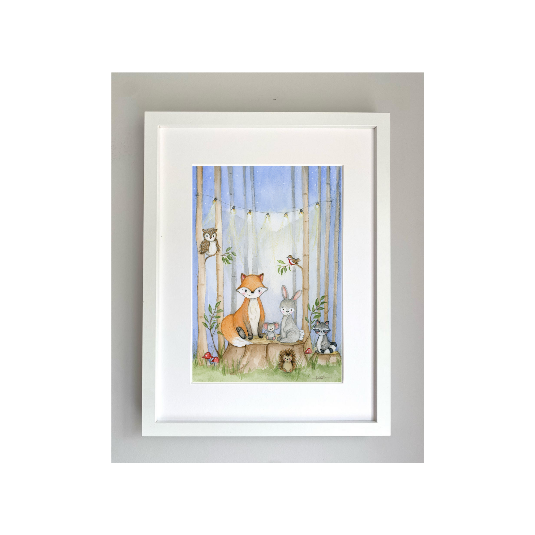 This is a fine art print a lovely watercolour painting of a forest animals at night. This picture will create feelings of friendship and wonder. It will brighten up any room. Whether you want to decorate your nursery or surprise someone with a thoughtful gift for their new baby, this print is perfect for you.