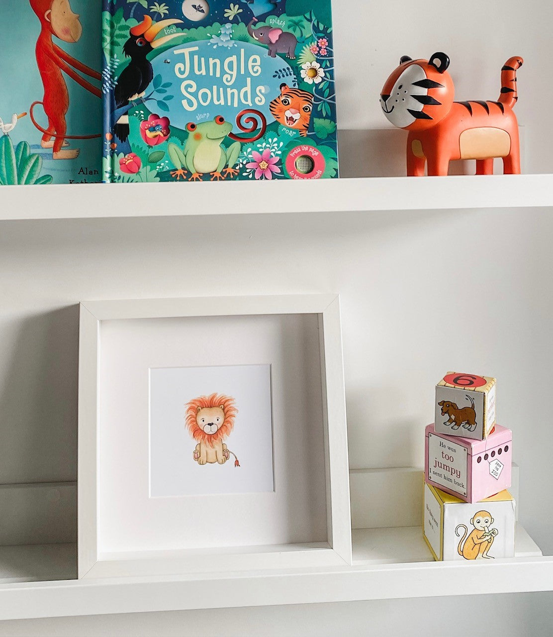 "Roar with cuteness and personalize your child's space with this Mini Lion Illustration. Featuring a cute watercolour lion, this versatile piece can be customized with your child's name, date of birth, or a fun slogan. Let this quirky illustration add a playful touch to any room!"