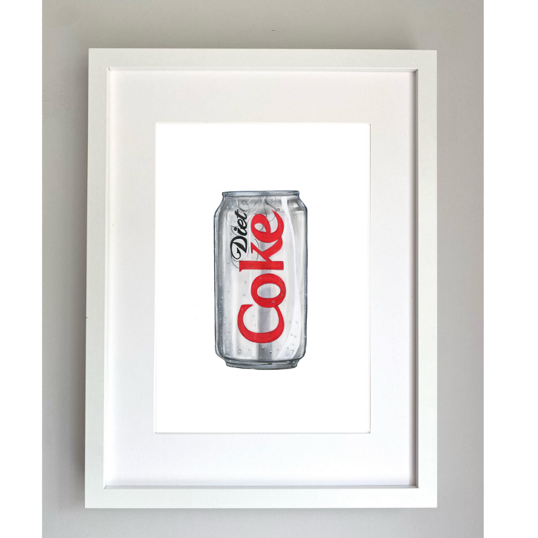 A4 Print of a can of Diet Coke painted in Gouache and colorings pencil.