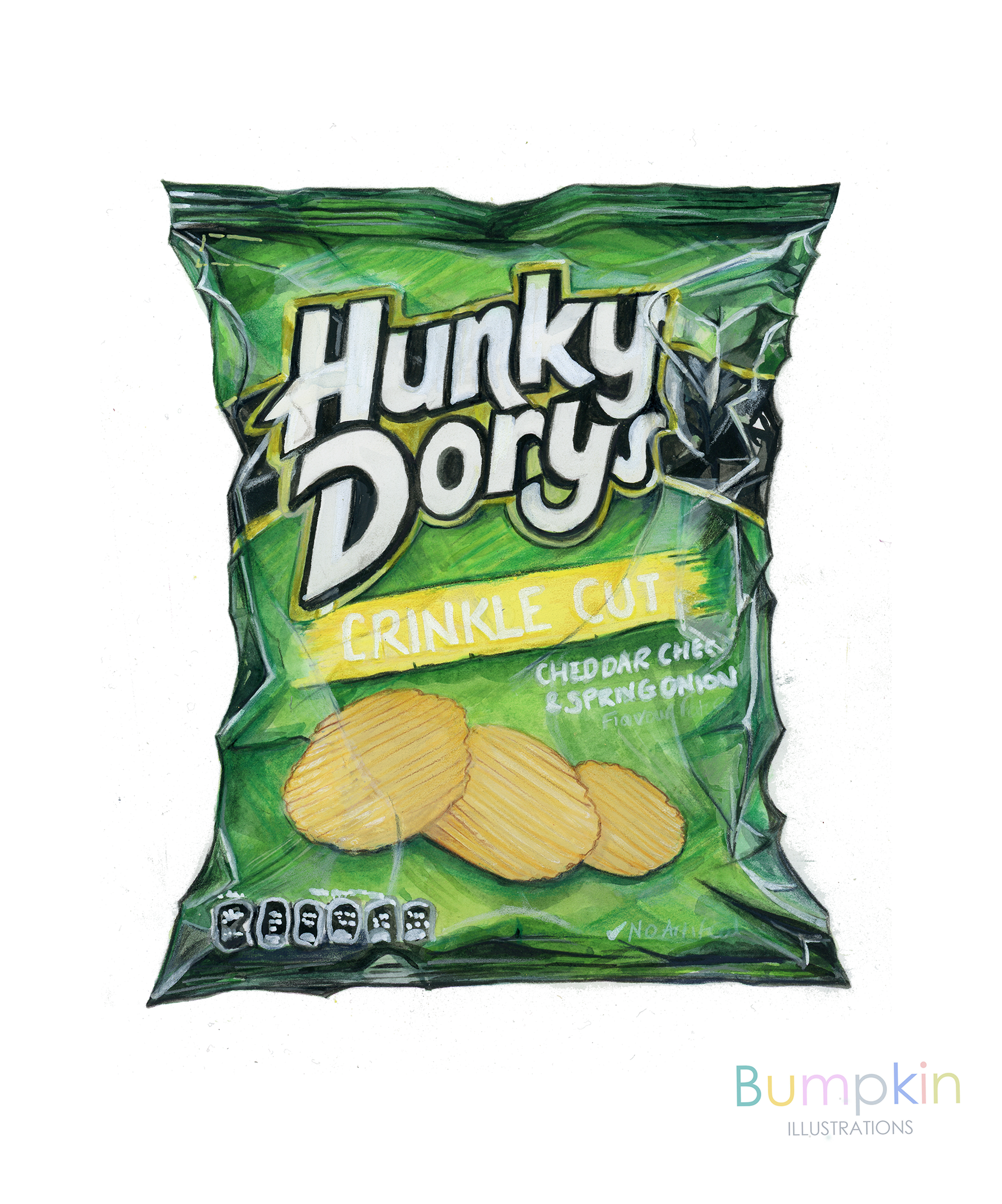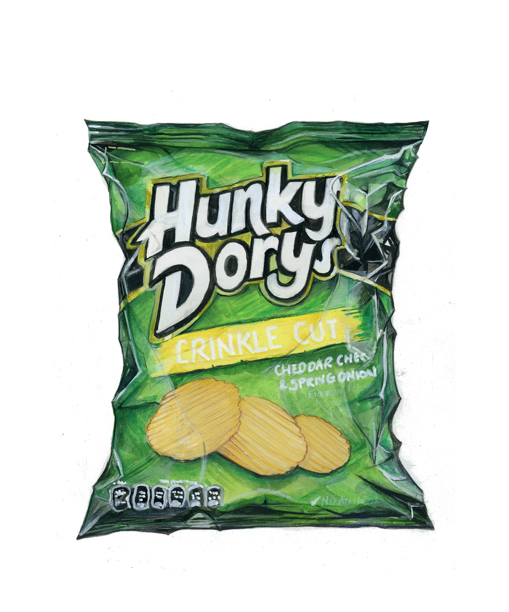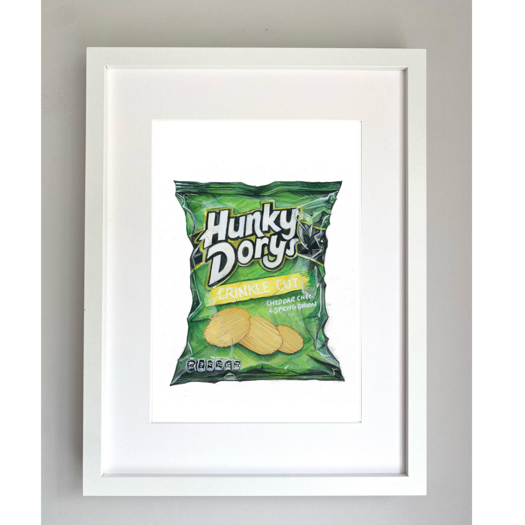 A4 Print of Hunky Dorys Crisp Packet, painted in watercolour, gouache and colorings pencils.