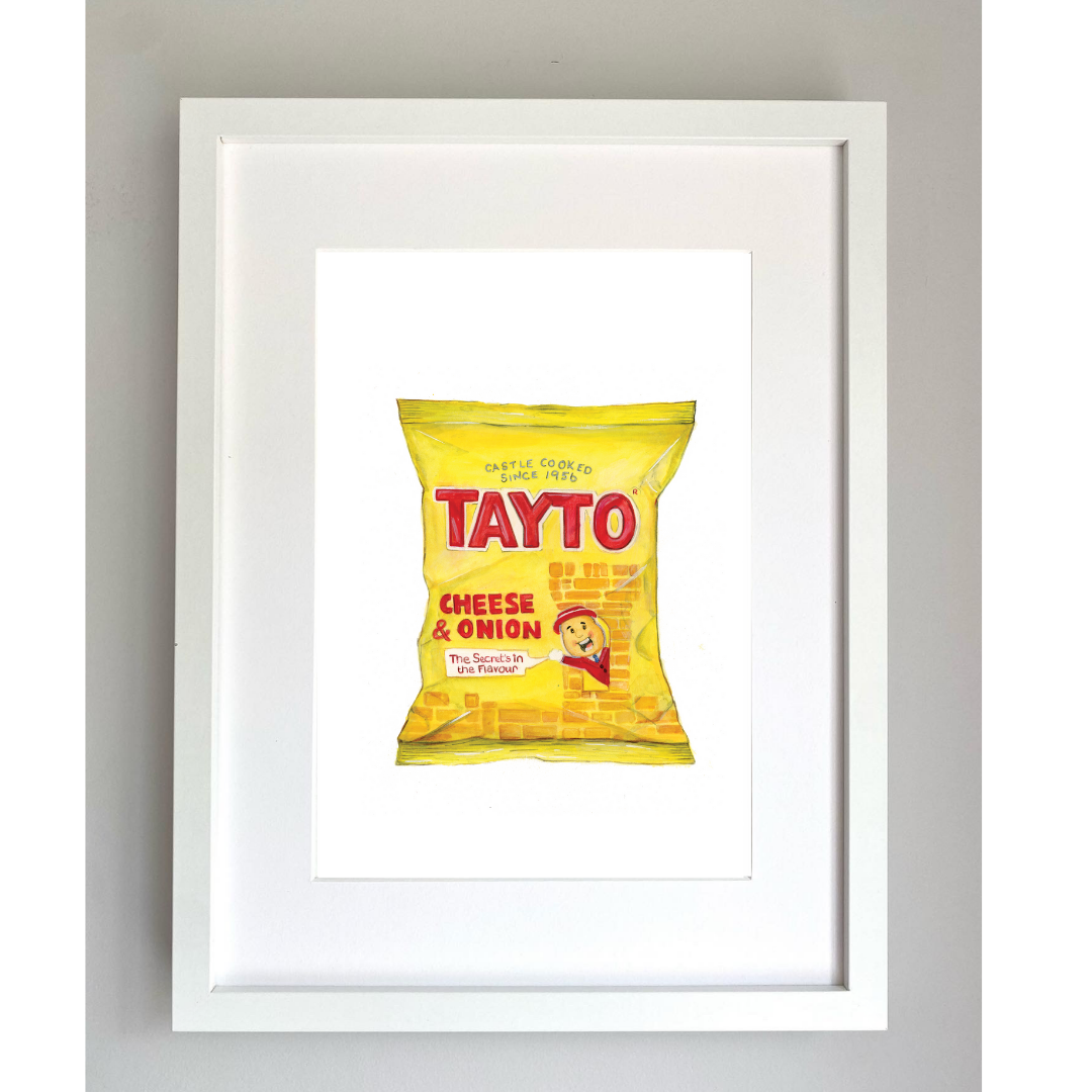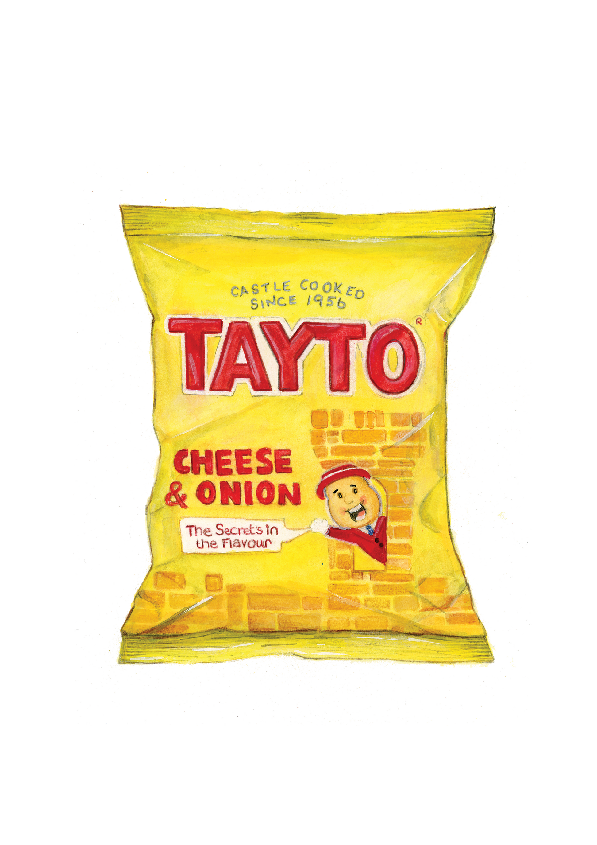 A4 Print of the Northern Ireland Yellow Tayto crisps, painted in Gouache and colorings pencil.
