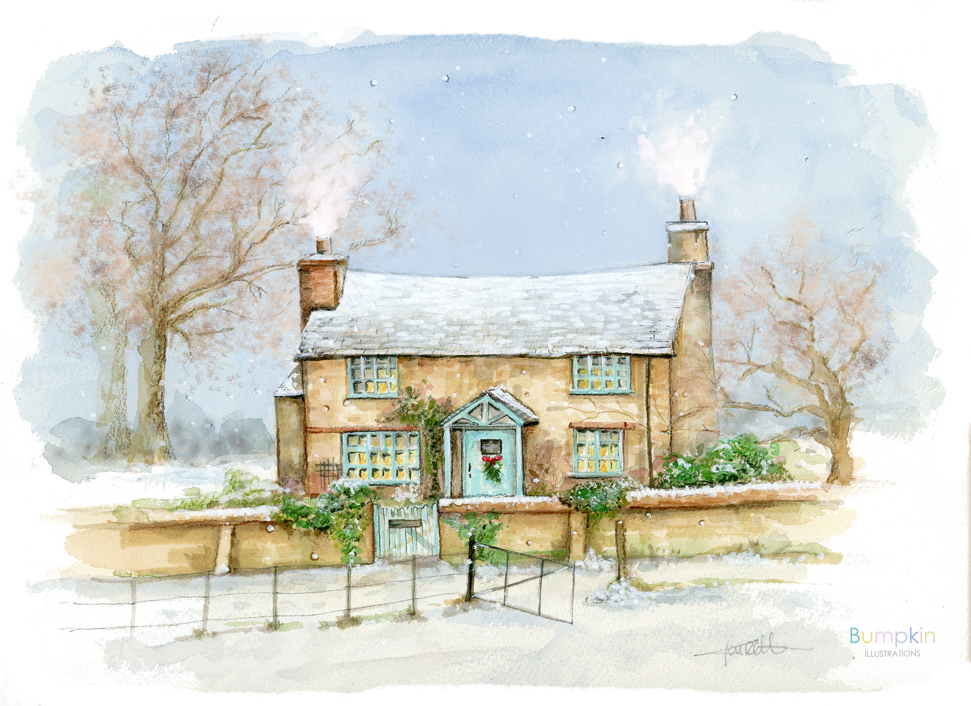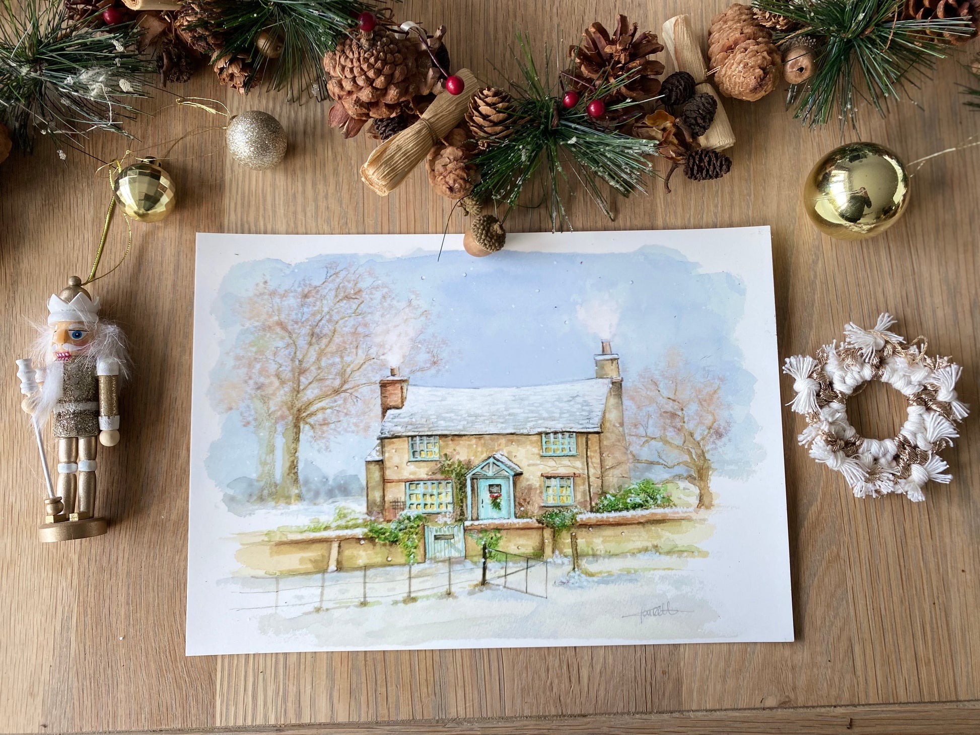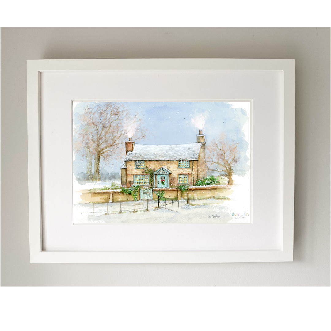 A4 Print of a watercolour painting Rosehill cottage from the classic Christmas movie The Holiday painted by Claire McConville